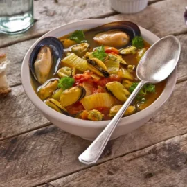 Coloque pimenta e sal a gosto. Adicione os mexilhões e deixe ferver por alguns minutos.